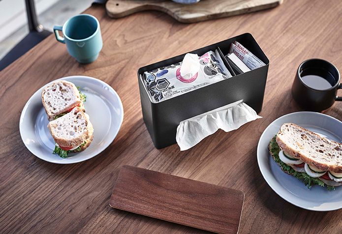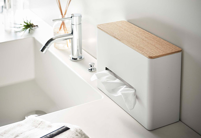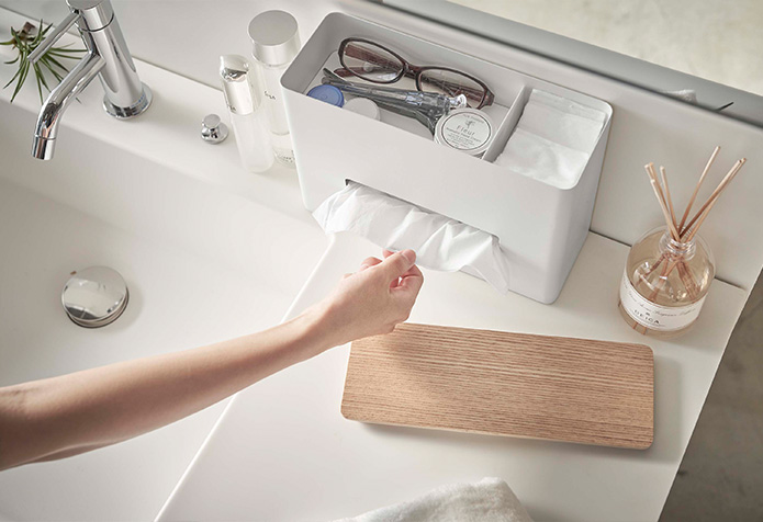 ティッシュとウェットシートを同時に収納でき、卓上で散らかりがちな小物類をまとめて収納できます。 スリムなので、置き場所も選ばず、リビングやサニタリールームでもご使用いただけます。 上段にはウェットティッシュや小物が置けます。 メガネやコンタクトレンズの一時置きにも。