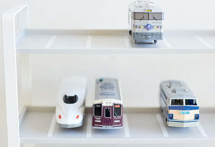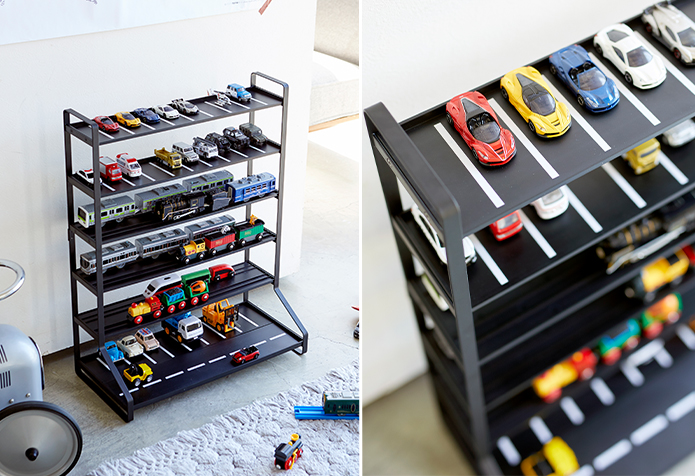 ミニカーやレールトイを飾りながら収納できるラック。トレーはミニカー用・レールトイ用の両面仕様です。 子供と楽しく飾りながらお片付けができるラックです。トレーが両面使えるので持っているおもちゃの量に合わせてトレーを設置できます。ミニカー専用・レールトイ専用として使用することもできます。